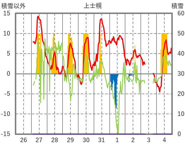 | 日 | 時 | 気温 | 降水 | 風向/風速 | 日照 | 積雪 | 降雪 |