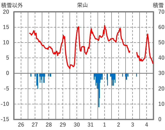 | 日 | 時 | 気温 | 降水 | 風向/風速 | 日照 | 積雪 | 降雪 |