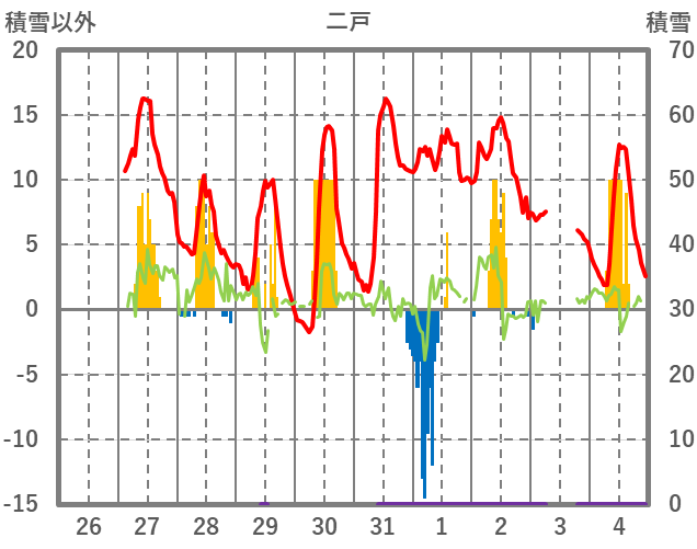 | 日 | 時 | 気温 | 降水 | 風向/風速 | 日照 | 積雪 | 降雪 |