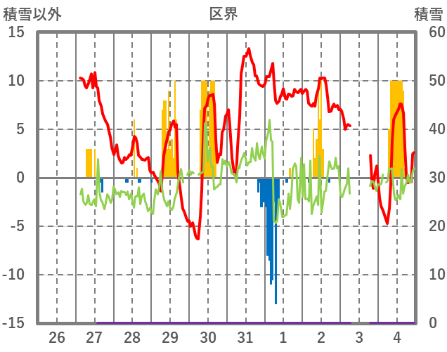 | 日 | 時 | 気温 | 降水 | 風向/風速 | 日照 | 積雪 | 降雪 |