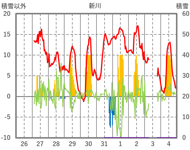 | 日 | 時 | 気温 | 降水 | 風向/風速 | 日照 | 積雪 | 降雪 |