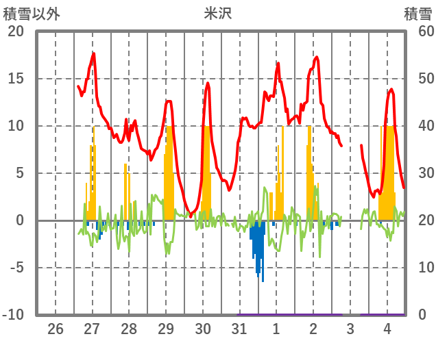 | 日 | 時 | 気温 | 降水 | 風向/風速 | 日照 | 積雪 | 降雪 |