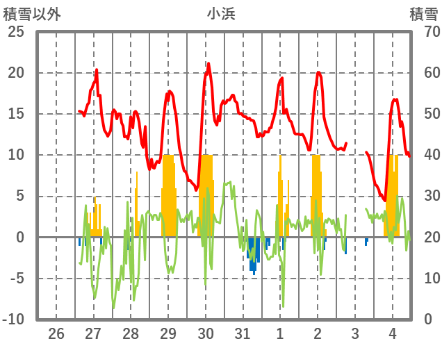 | 日 | 時 | 気温 | 降水 | 風向/風速 | 日照 | 積雪 | 降雪 |