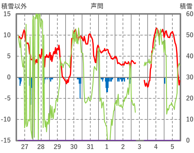 | 日 | 時 | 気温 | 降水 | 風向/風速 | 日照 | 積雪 | 降雪 |