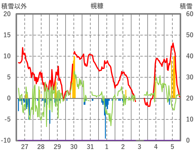 | 日 | 時 | 気温 | 降水 | 風向/風速 | 日照 | 積雪 | 降雪 |