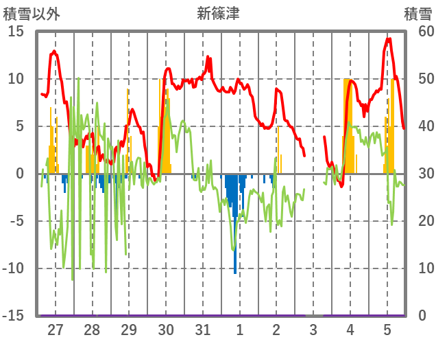 | 日 | 時 | 気温 | 降水 | 風向/風速 | 日照 | 積雪 | 降雪 |