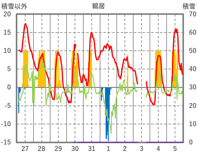 | 日 | 時 | 気温 | 降水 | 風向/風速 | 日照 | 積雪 | 降雪 |