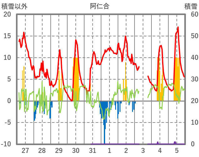 | 日 | 時 | 気温 | 降水 | 風向/風速 | 日照 | 積雪 | 降雪 |