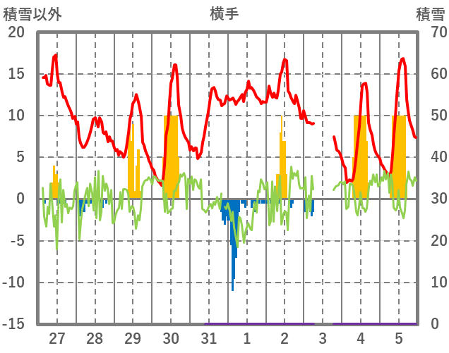 | 日 | 時 | 気温 | 降水 | 風向/風速 | 日照 | 積雪 | 降雪 |