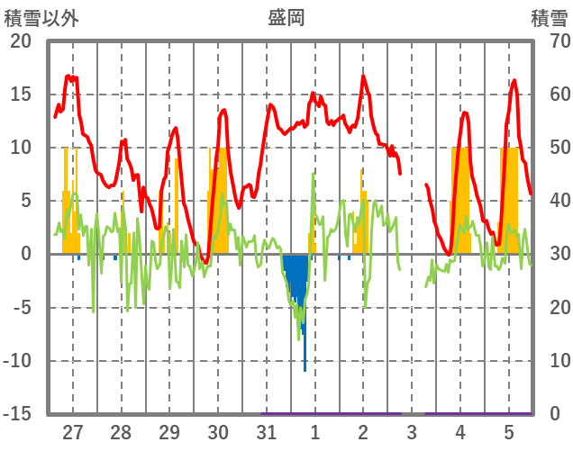 | 日 | 時 | 気温 | 降水 | 風向/風速 | 日照 | 積雪 | 降雪 |