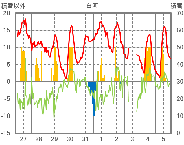 | 日 | 時 | 気温 | 降水 | 風向/風速 | 日照 | 積雪 | 降雪 |