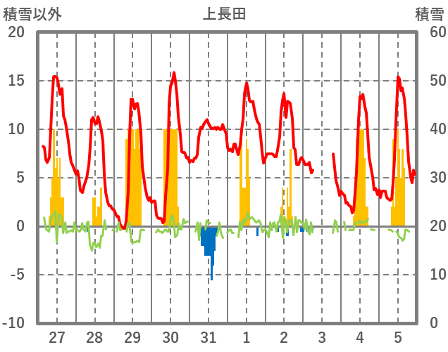 | 日 | 時 | 気温 | 降水 | 風向/風速 | 日照 | 積雪 | 降雪 |