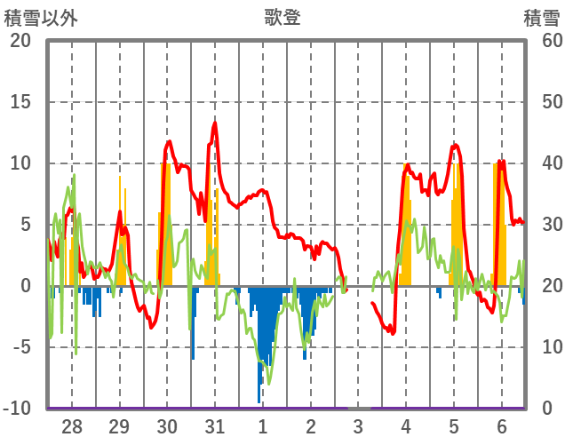 | 日 | 時 | 気温 | 降水 | 風向/風速 | 日照 | 積雪 | 降雪 |