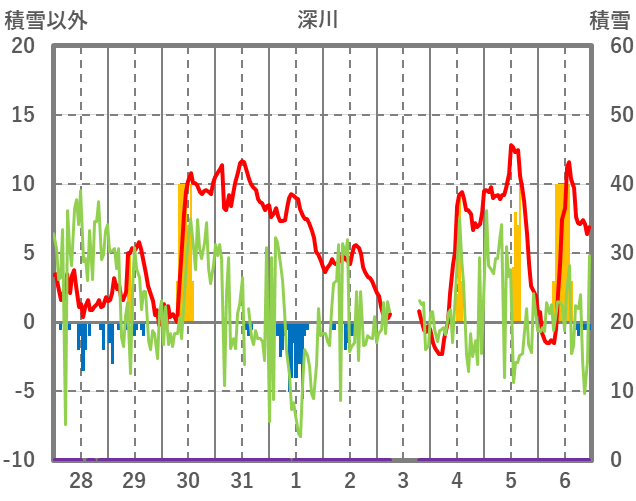 | 日 | 時 | 気温 | 降水 | 風向/風速 | 日照 | 積雪 | 降雪 |