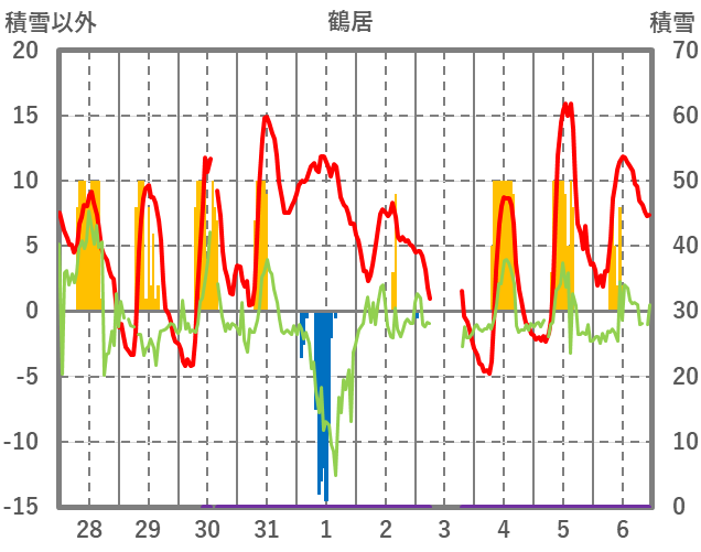 | 日 | 時 | 気温 | 降水 | 風向/風速 | 日照 | 積雪 | 降雪 |