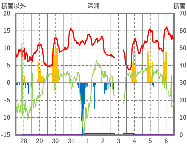 | 日 | 時 | 気温 | 降水 | 風向/風速 | 日照 | 積雪 | 降雪 |