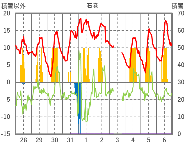 | 日 | 時 | 気温 | 降水 | 風向/風速 | 日照 | 積雪 | 降雪 |