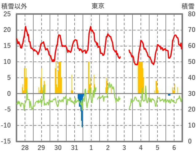 | 日 | 時 | 気温 | 降水 | 風向/風速 | 日照 | 積雪 | 降雪 |