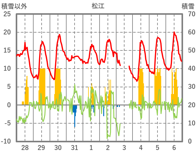 | 日 | 時 | 気温 | 降水 | 風向/風速 | 日照 | 積雪 | 降雪 |