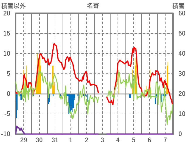 | 日 | 時 | 気温 | 降水 | 風向/風速 | 日照 | 積雪 | 降雪 |