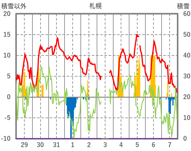 | 日 | 時 | 気温 | 降水 | 風向/風速 | 日照 | 積雪 | 降雪 |