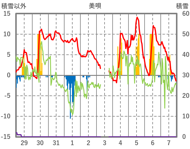 | 日 | 時 | 気温 | 降水 | 風向/風速 | 日照 | 積雪 | 降雪 |