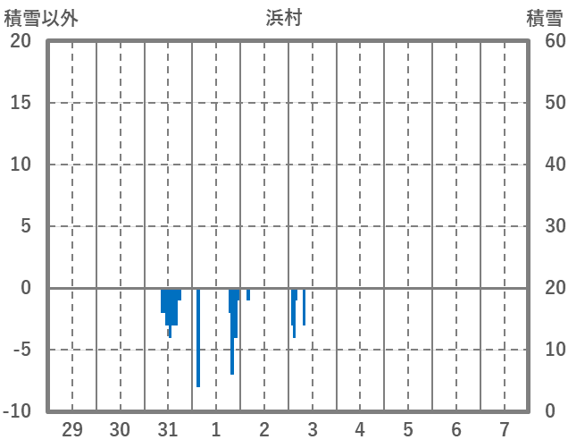 | 日 | 時 | 気温 | 降水 | 風向/風速 | 日照 | 積雪 | 降雪 |