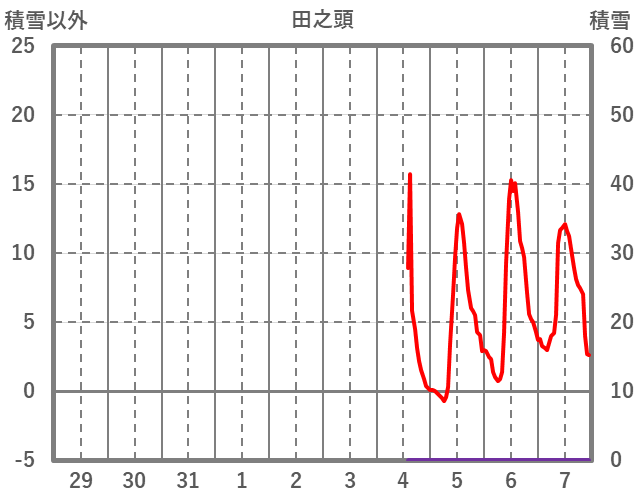 | 日 | 時 | 気温 | 降水 | 風向/風速 | 日照 | 積雪 | 降雪 |