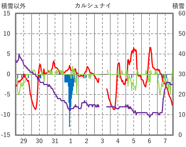 | 日 | 時 | 気温 | 降水 | 風向/風速 | 日照 | 積雪 | 降雪 |
