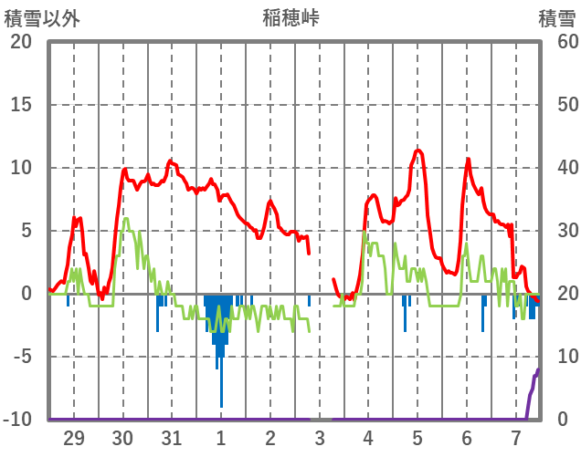 | 日 | 時 | 気温 | 降水 | 風向/風速 | 日照 | 積雪 | 降雪 |