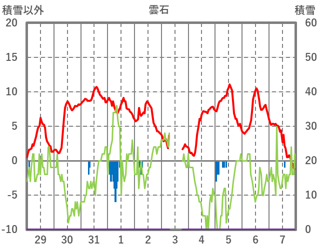| 日 | 時 | 気温 | 降水 | 風向/風速 | 日照 | 積雪 | 降雪 |