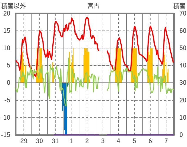 | 日 | 時 | 気温 | 降水 | 風向/風速 | 日照 | 積雪 | 降雪 |