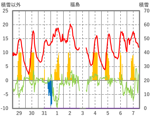 | 日 | 時 | 気温 | 降水 | 風向/風速 | 日照 | 積雪 | 降雪 |