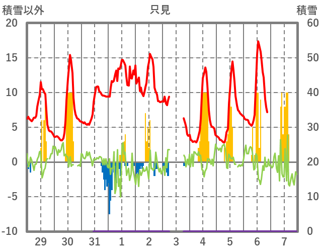| 日 | 時 | 気温 | 降水 | 風向/風速 | 日照 | 積雪 | 降雪 |