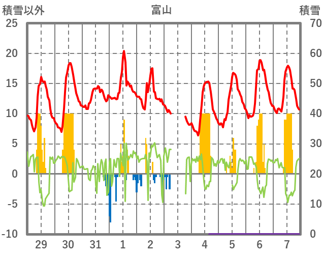 | 日 | 時 | 気温 | 降水 | 風向/風速 | 日照 | 積雪 | 降雪 |
