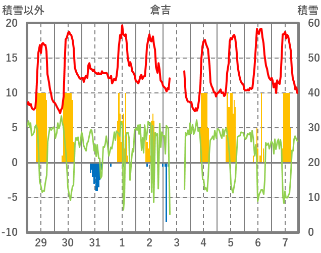 | 日 | 時 | 気温 | 降水 | 風向/風速 | 日照 | 積雪 | 降雪 |