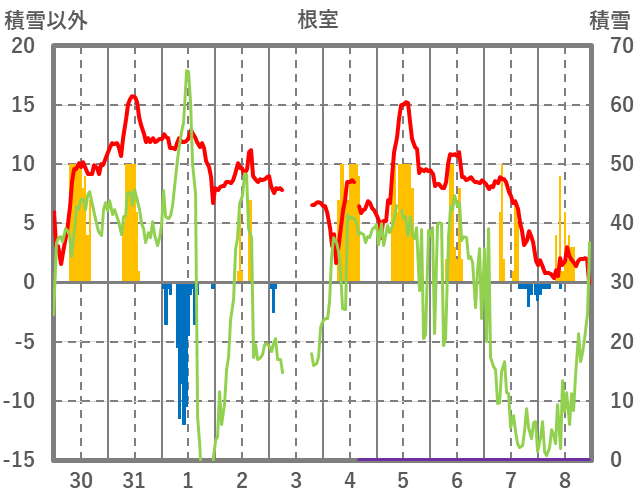 | 日 | 時 | 気温 | 降水 | 風向/風速 | 日照 | 積雪 | 降雪 |