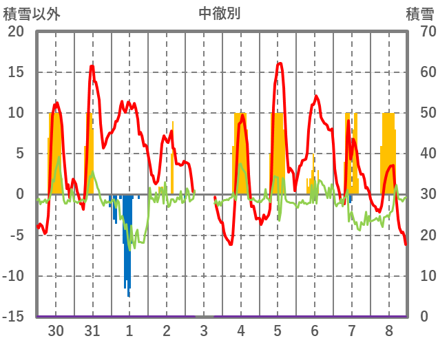 | 日 | 時 | 気温 | 降水 | 風向/風速 | 日照 | 積雪 | 降雪 |