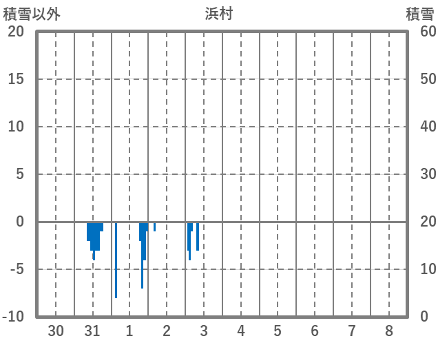 | 日 | 時 | 気温 | 降水 | 風向/風速 | 日照 | 積雪 | 降雪 |