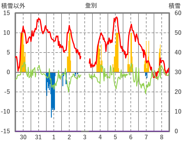 | 日 | 時 | 気温 | 降水 | 風向/風速 | 日照 | 積雪 | 降雪 |