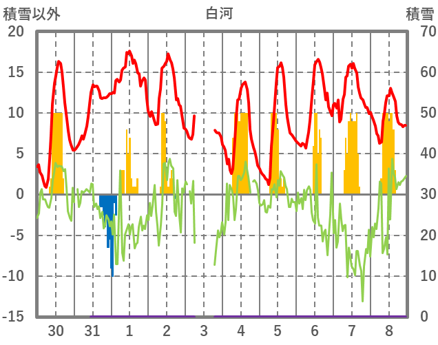 | 日 | 時 | 気温 | 降水 | 風向/風速 | 日照 | 積雪 | 降雪 |