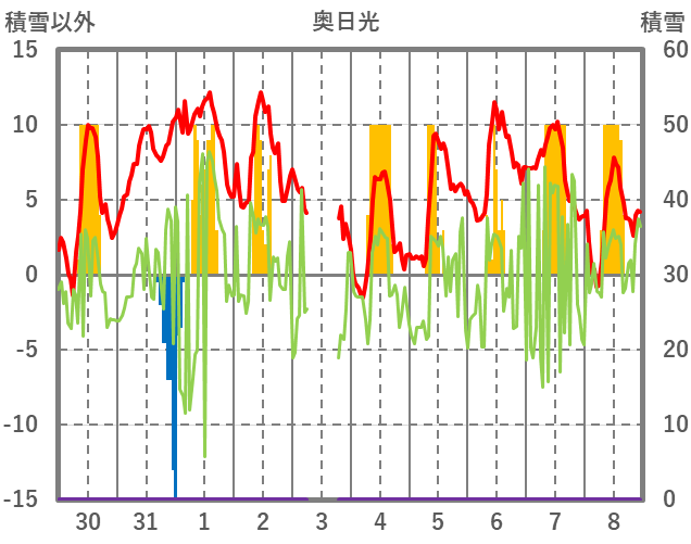 | 日 | 時 | 気温 | 降水 | 風向/風速 | 日照 | 積雪 | 降雪 |