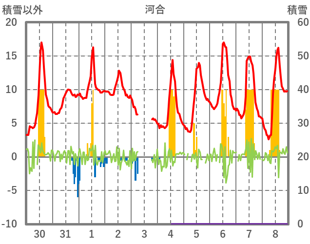 | 日 | 時 | 気温 | 降水 | 風向/風速 | 日照 | 積雪 | 降雪 |