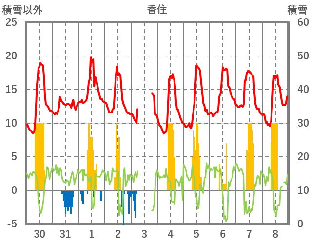 | 日 | 時 | 気温 | 降水 | 風向/風速 | 日照 | 積雪 | 降雪 |