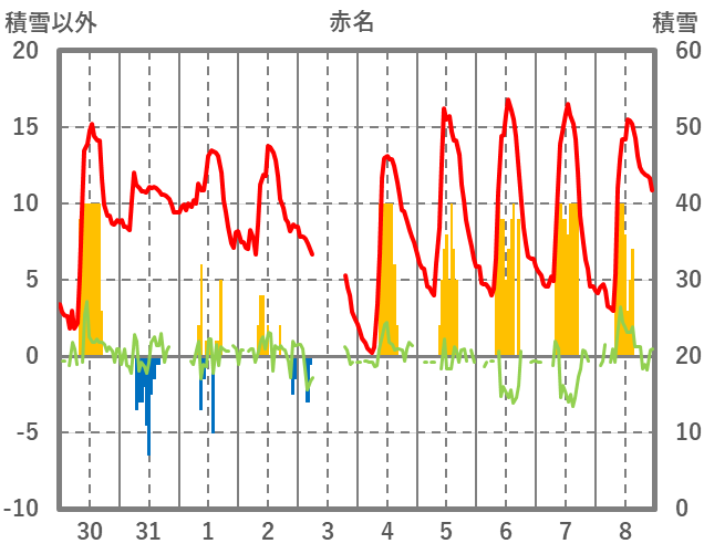 | 日 | 時 | 気温 | 降水 | 風向/風速 | 日照 | 積雪 | 降雪 |