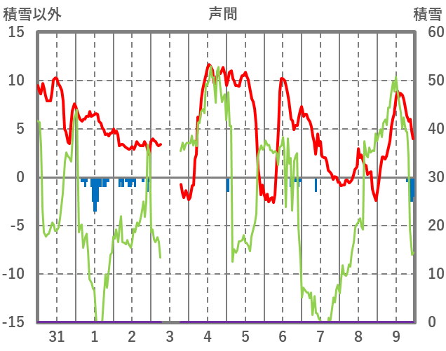 | 日 | 時 | 気温 | 降水 | 風向/風速 | 日照 | 積雪 | 降雪 |
