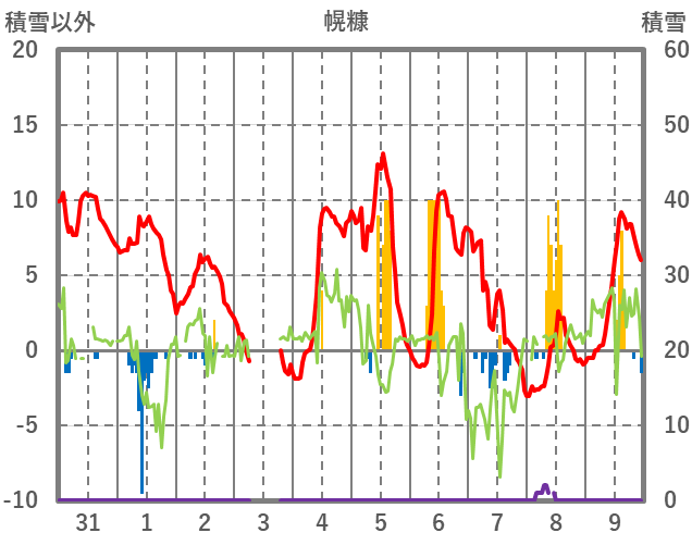 | 日 | 時 | 気温 | 降水 | 風向/風速 | 日照 | 積雪 | 降雪 |