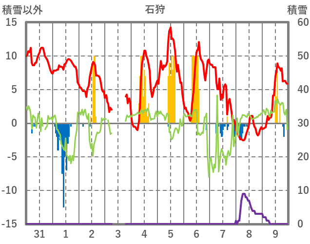 | 日 | 時 | 気温 | 降水 | 風向/風速 | 日照 | 積雪 | 降雪 |