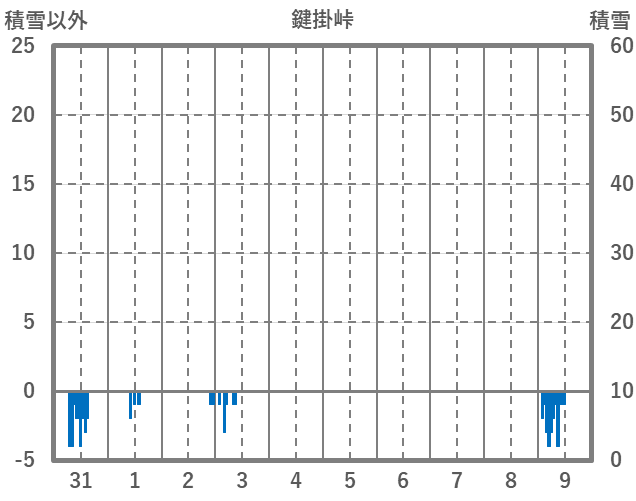 | 日 | 時 | 気温 | 降水 | 風向/風速 | 日照 | 積雪 | 降雪 |