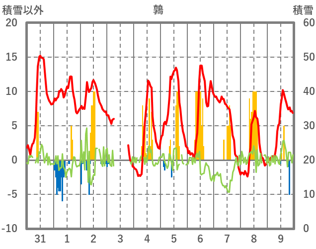 | 日 | 時 | 気温 | 降水 | 風向/風速 | 日照 | 積雪 | 降雪 |